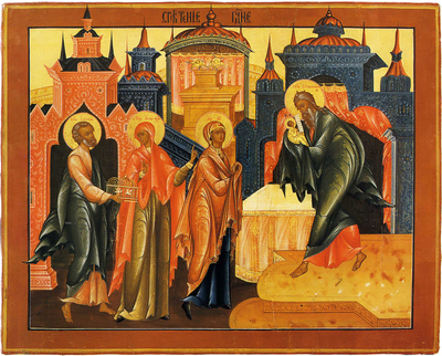 "Не имел я, – как бы так говорил он, – мира в мыслях своих, все дни ожидая Тебя, и все дни пребывал в печали, пока Ты приидешь: ныне же, увидев Тебя, я получил Дар, и, освободившись от печали, отхожу отсюда с радостною вестью к моим отцам: возвещу о Твоем пришествии в мир праотцу Адаму и Аврааму, Моисею и Давиду, Исаии и прочим святым отцам и пророкам, неизреченную радость принесу я им, пребывающим доселе в печали; к ним и отпусти меня, дабы, оставив печаль, они возвеселились о Тебе – Избавителе своем. Отпусти меня раба Твоего, после многолетних трудов, успокоиться на лоне Авраамовом: очи мои уже видели Спасение Твое, уготованное для всех людей, очи мои видели Свет, уготованный для рассеяния тьмы, для просвещения народов, для откровения им неведомых Божественных Таин, – Свет, воссиявший для прославления людей Твоих Израиля, Который Ты обещал чрез пророка Исаию, сказав: "Дам Сиону спасение, Израилю славу Мою" (Ис.46:13).